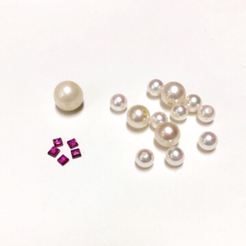 お客様のリングやブレスレットのあこやパールが、追加したルビーや小粒パールと一緒になって、ブローチ兼ペンダントに生まれ変わります。